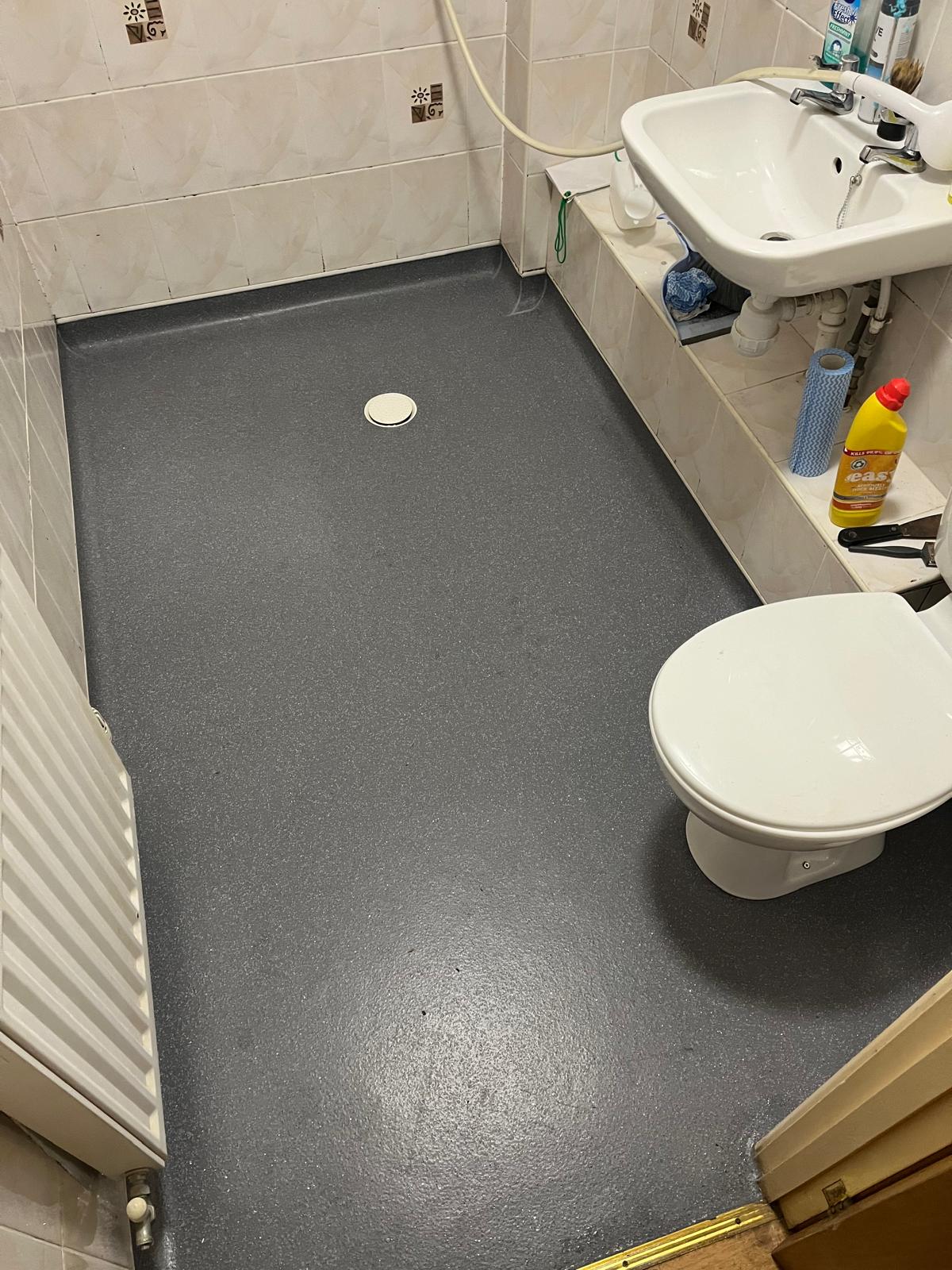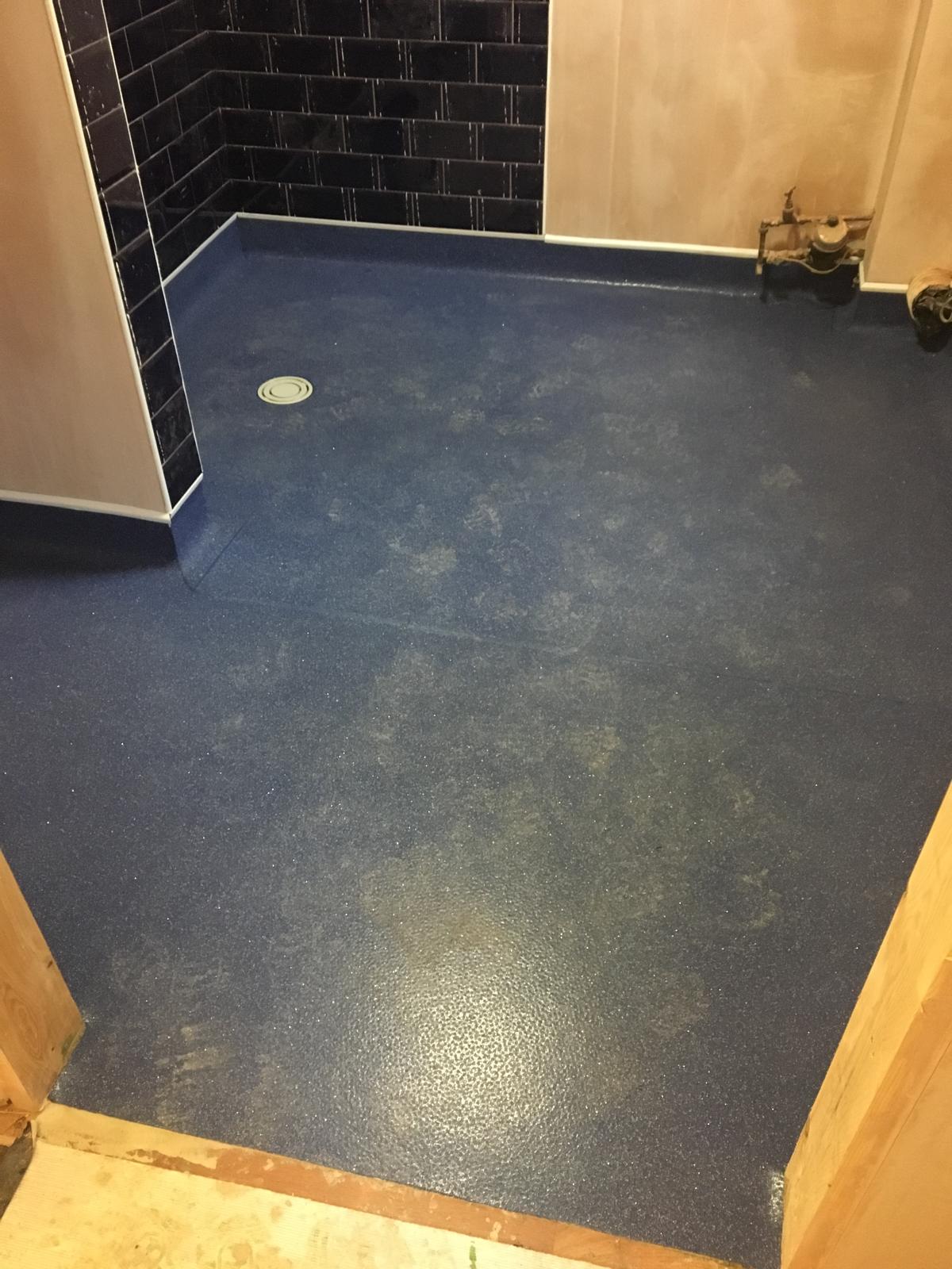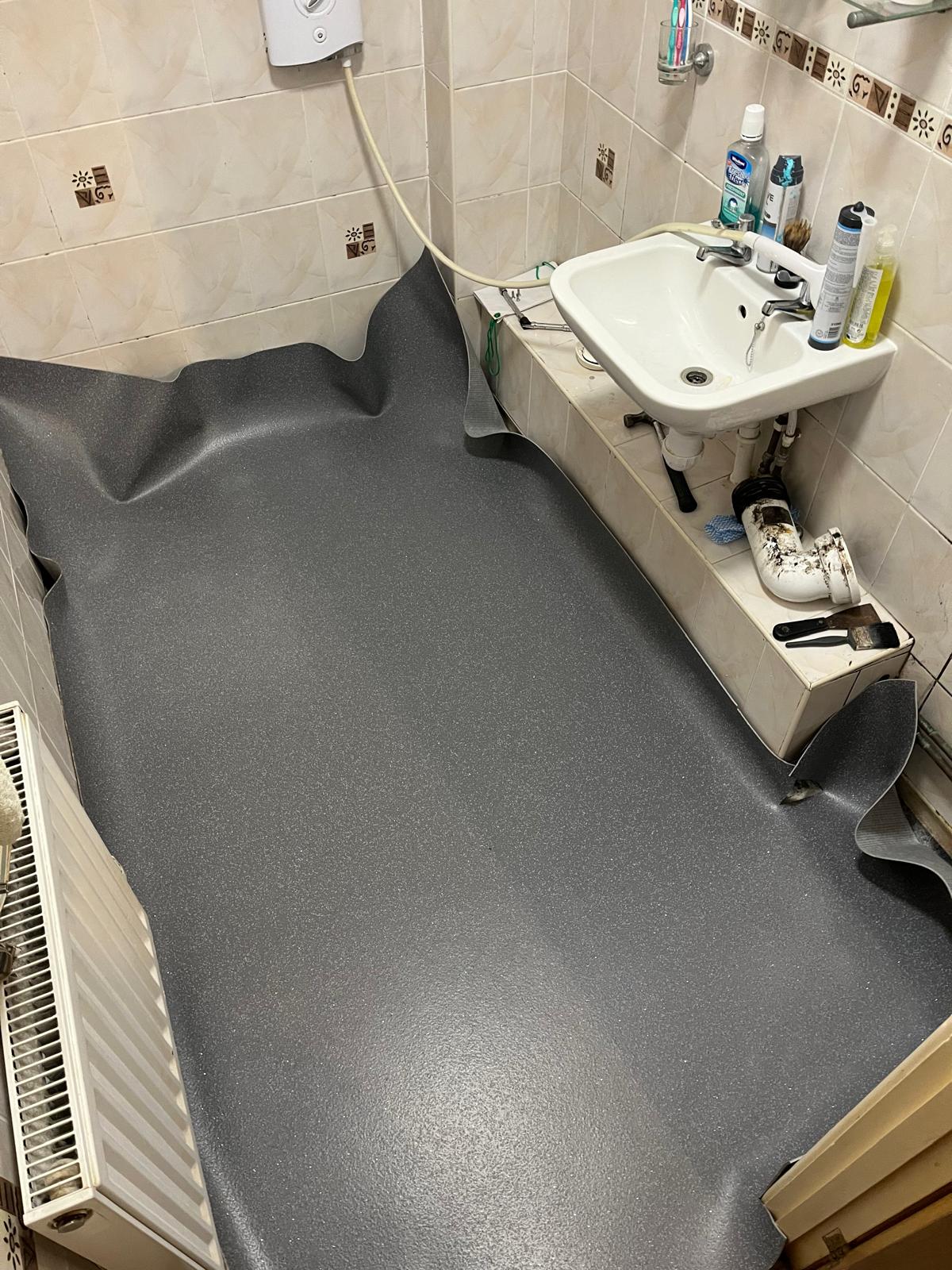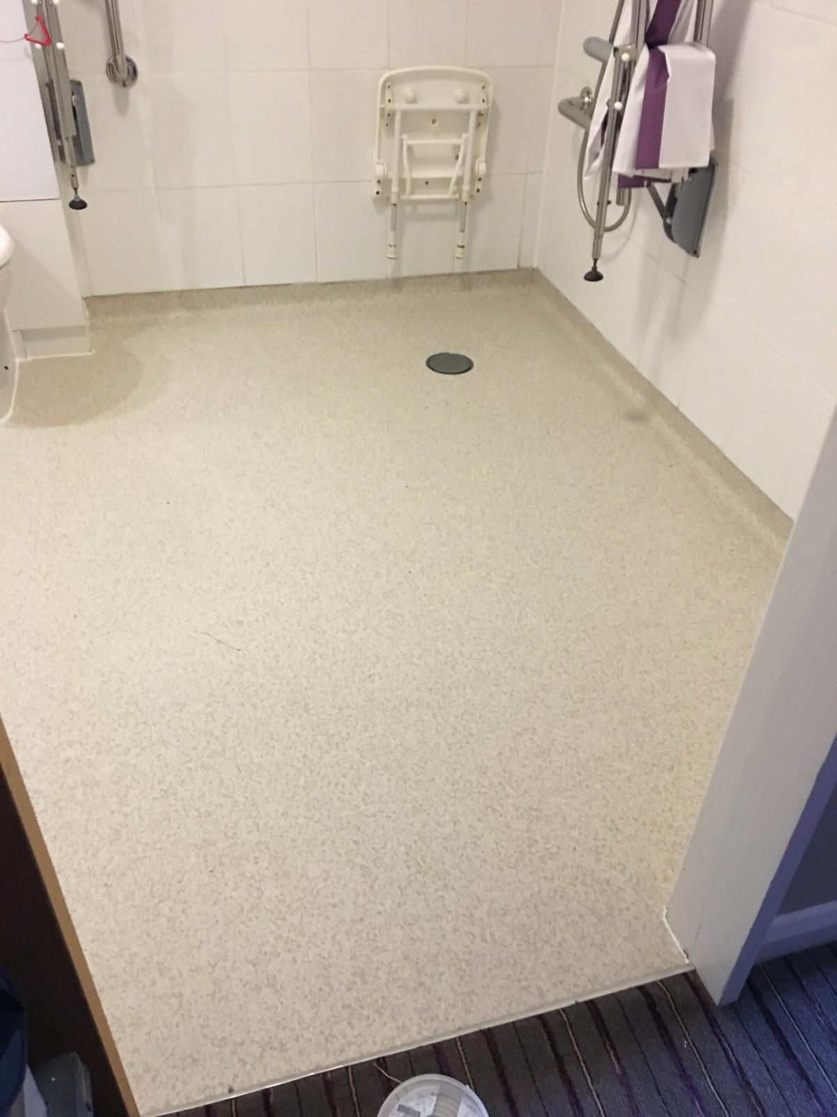 The waterproof floor covering merely climbs the walls, up to the level of a skirting board, to meet the tiles above. This provides a waterproof area, which can be encircled by a shower curtain. This allows access without “climbing” into a bath, or stepping into a raised shower cubicle.