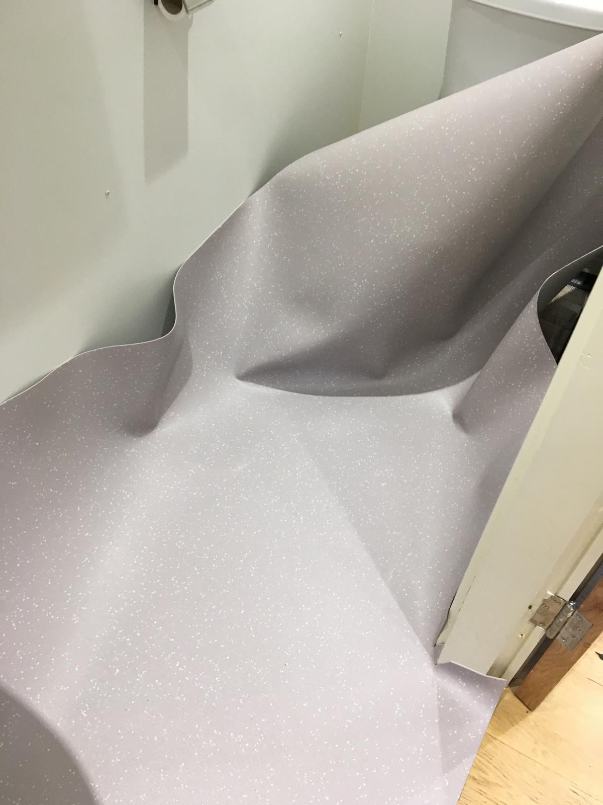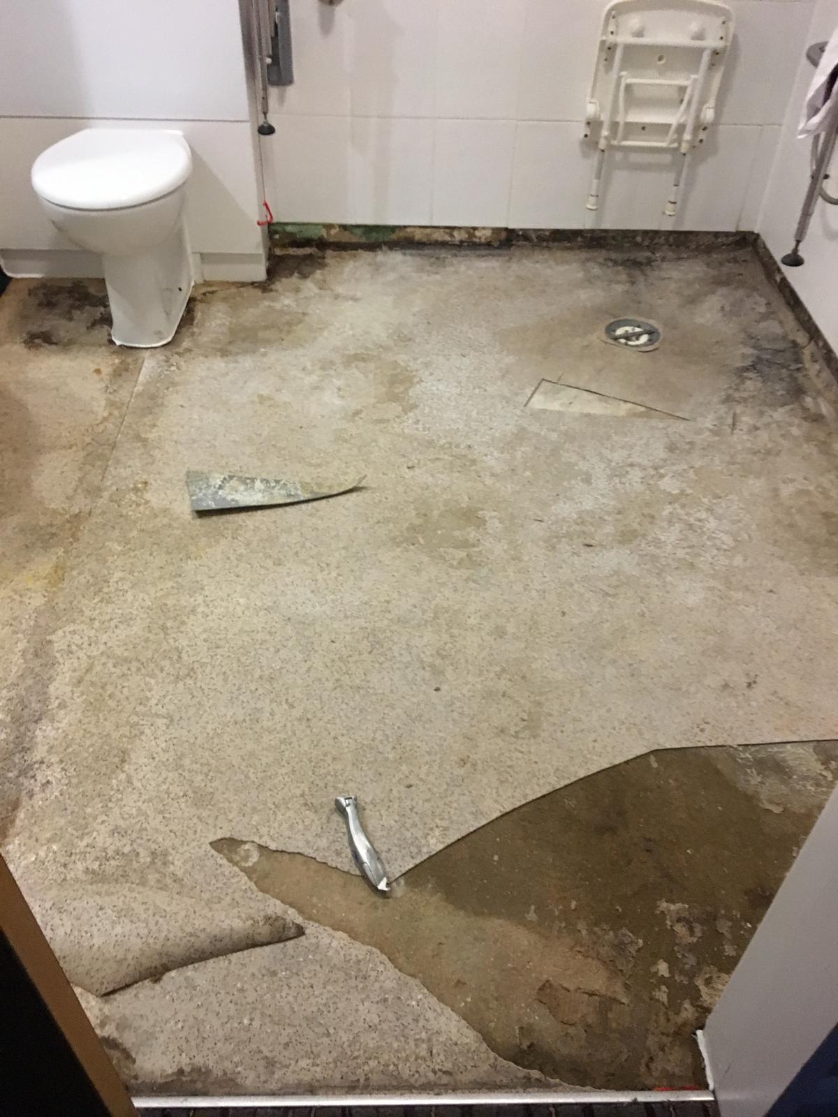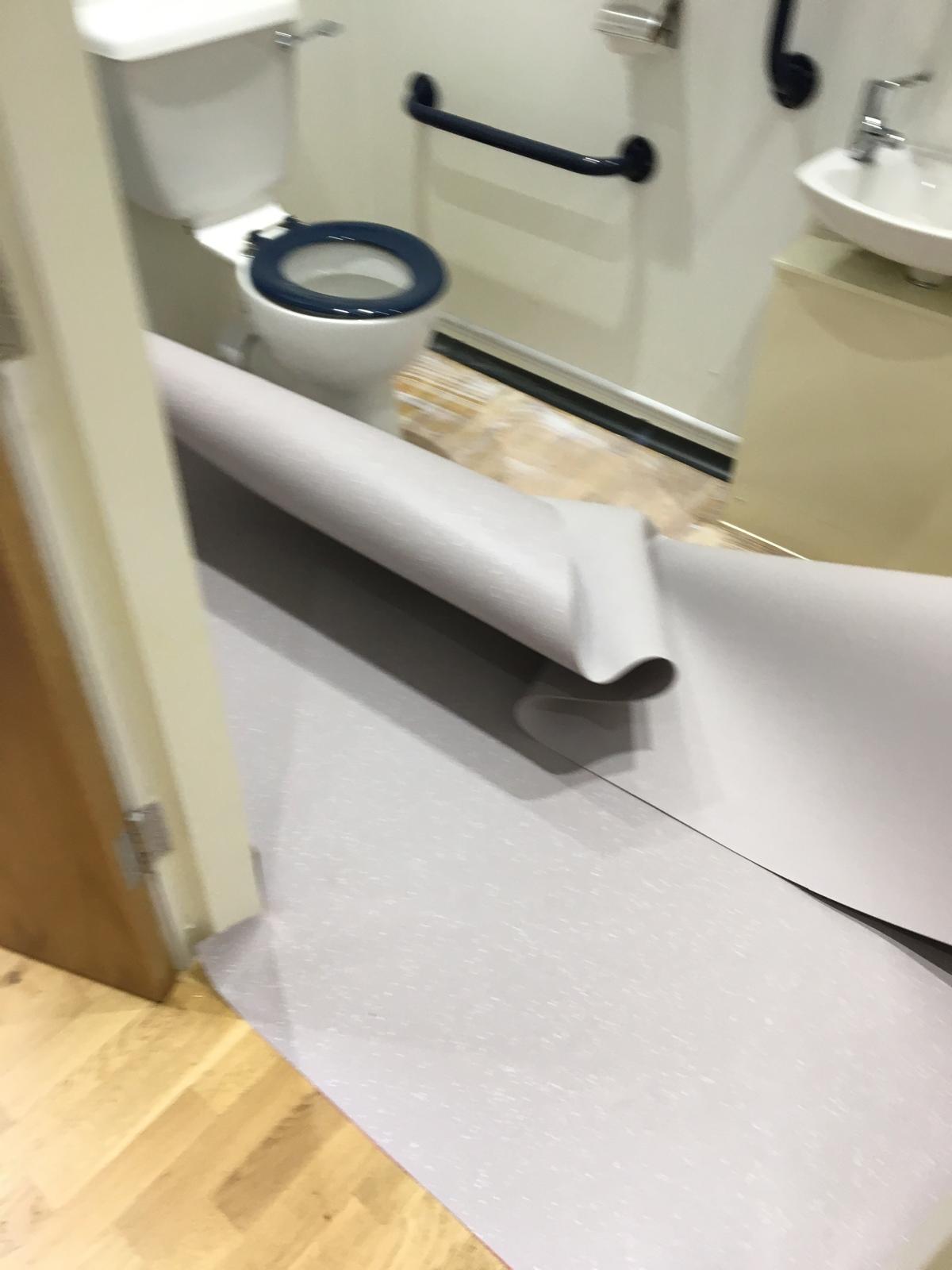 The waterproof floor covering merely climbs the walls, up to the level of a skirting board, to meet the tiles above. This provides a waterproof area, which can be encircled by a shower curtain. This allows access without “climbing” into a bath, or stepping into a raised shower cubicle.