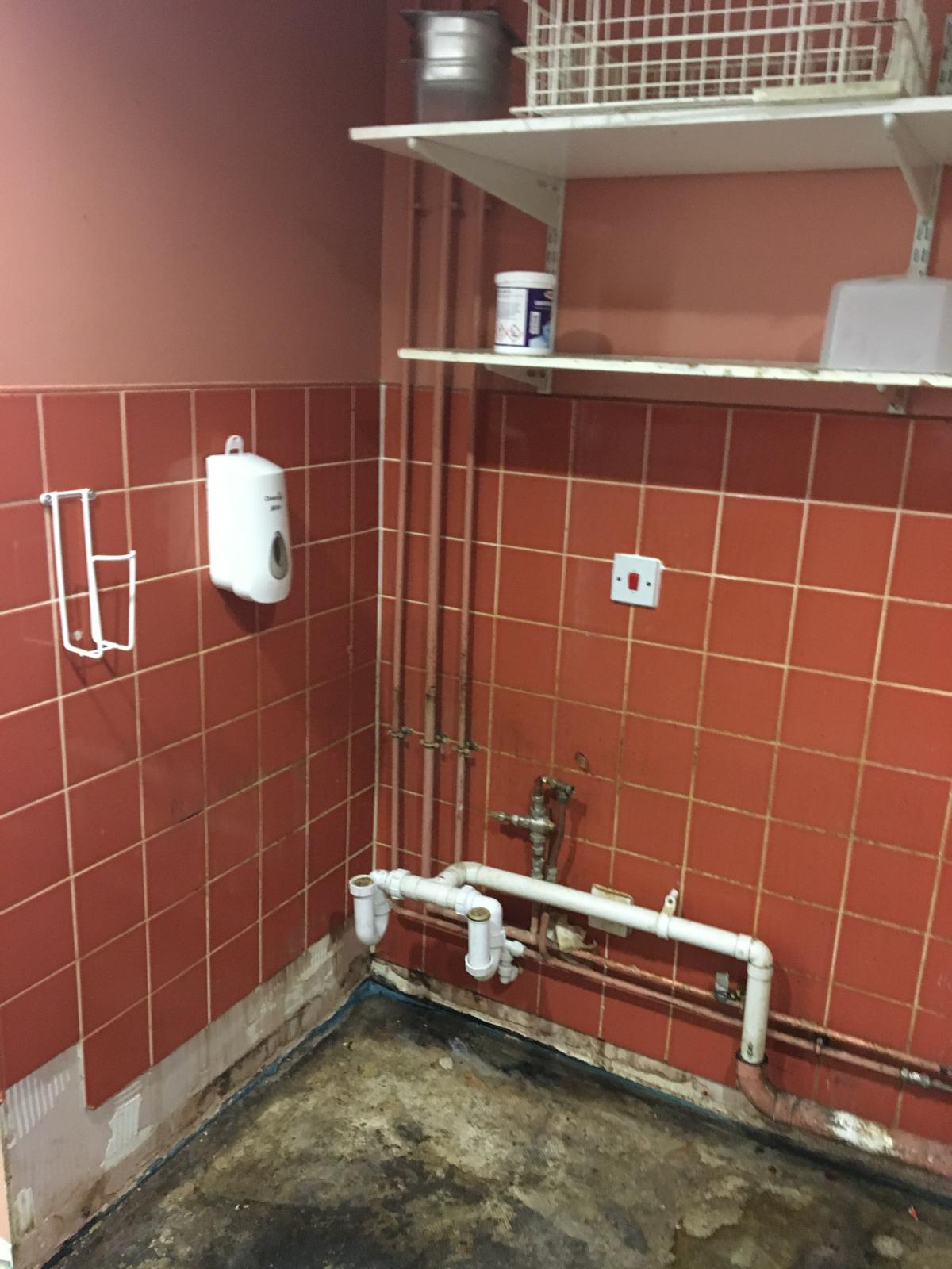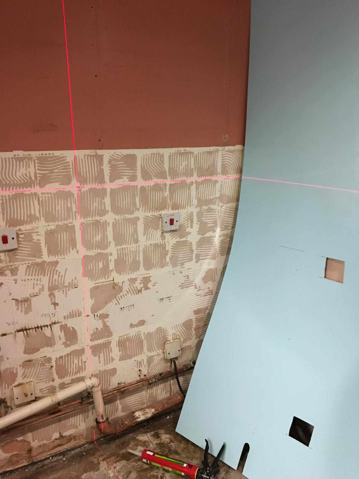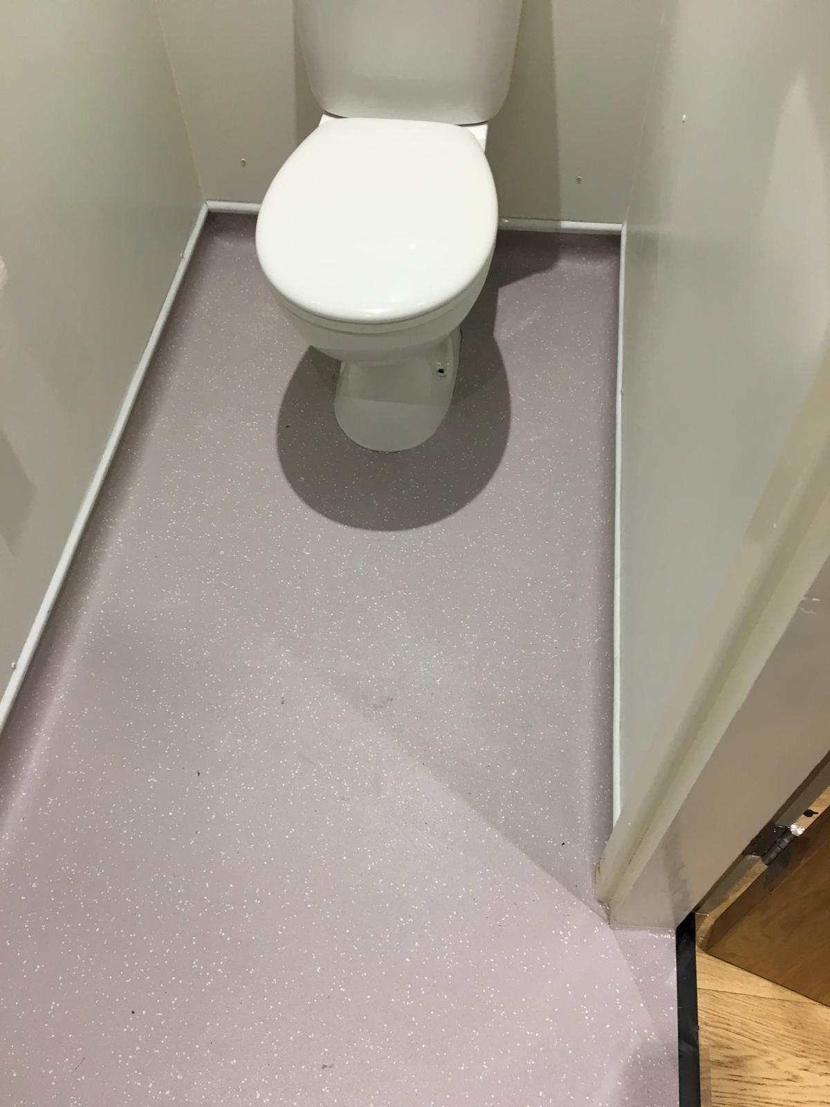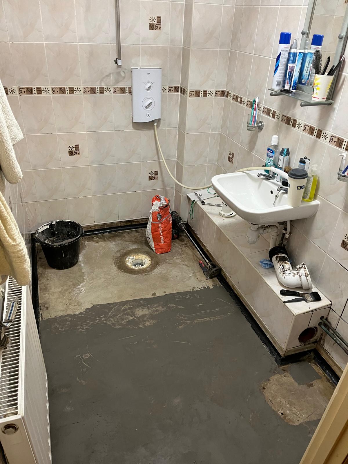 The waterproof floor covering merely climbs the walls, up to the level of a skirting board, to meet the tiles above. This provides a waterproof area, which can be encircled by a shower curtain. This allows access without “climbing” into a bath, or stepping into a raised shower cubicle.
